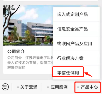 首先關注云涌科技官方微信公眾號,然后進入【產品中心】菜單,并點擊下拉菜單中的【零信任試用】進入試用頁面,點擊免費試用根據提示操作即可。