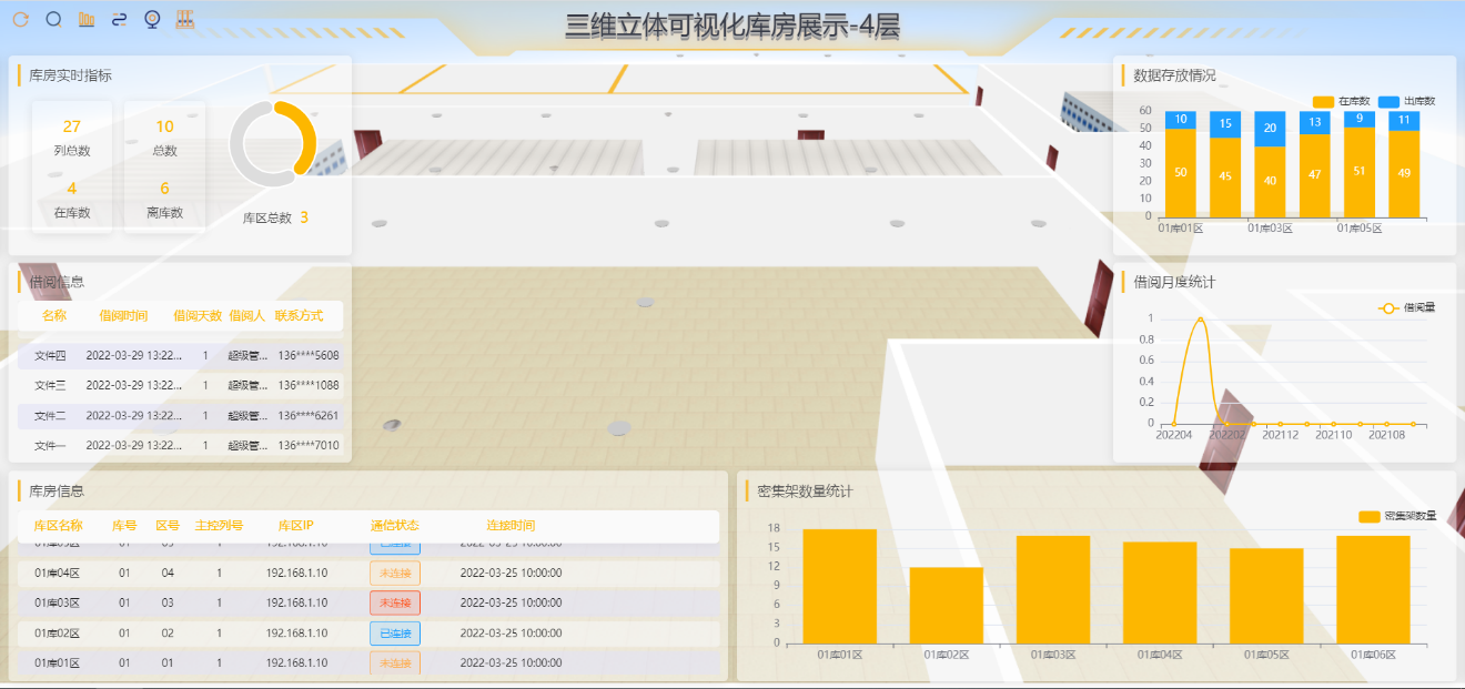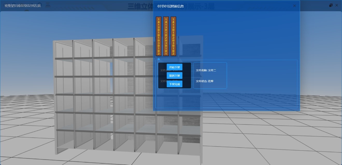 本系統(tǒng)結(jié)合用戶的深度業(yè)務(wù)邏輯,通過Three.Js三維可視化技術(shù)搭建數(shù)字孿生模型,使用IOT技術(shù)、運行歷史數(shù)據(jù),多尺度、多概率的仿真過程,在虛擬空間中完成映射,將真實設(shè)備與數(shù)字模型進(jìn)行耦合交互,實現(xiàn)設(shè)備實時運行狀態(tài)與數(shù)字孿生對象動作對應(yīng)(支持密集架開啟、關(guān)閉、查詢文件等)。