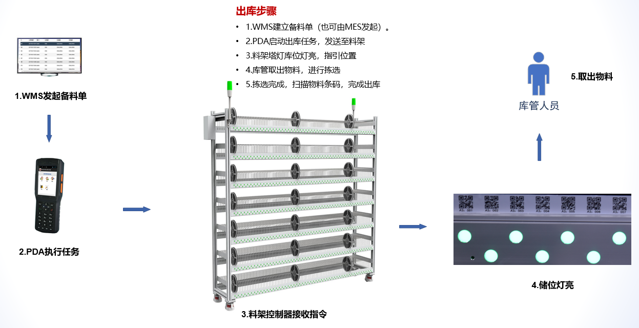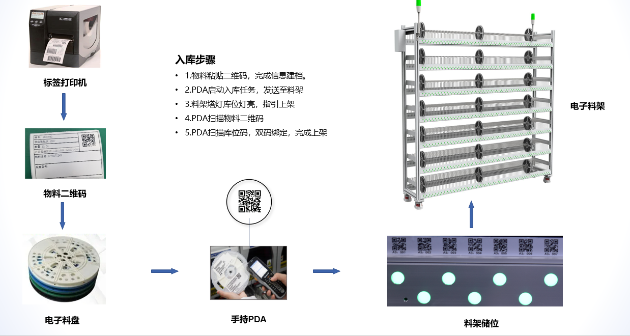 ? ? ? 對于SMT原材料使用電子料盤為存放單元,使用智能電子料架作為存儲設備。