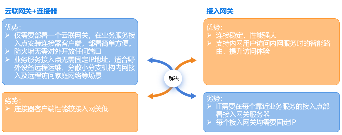 云涌遠程辦公解決方案支持兩種內網訪問模式:基于接入網關的訪問代理,以及基于云聯網關+連接器的內網穿透。客戶可以根據自身IT架構及實際需求選擇適合的服務訪問模式。兩種模式可以同時存在。