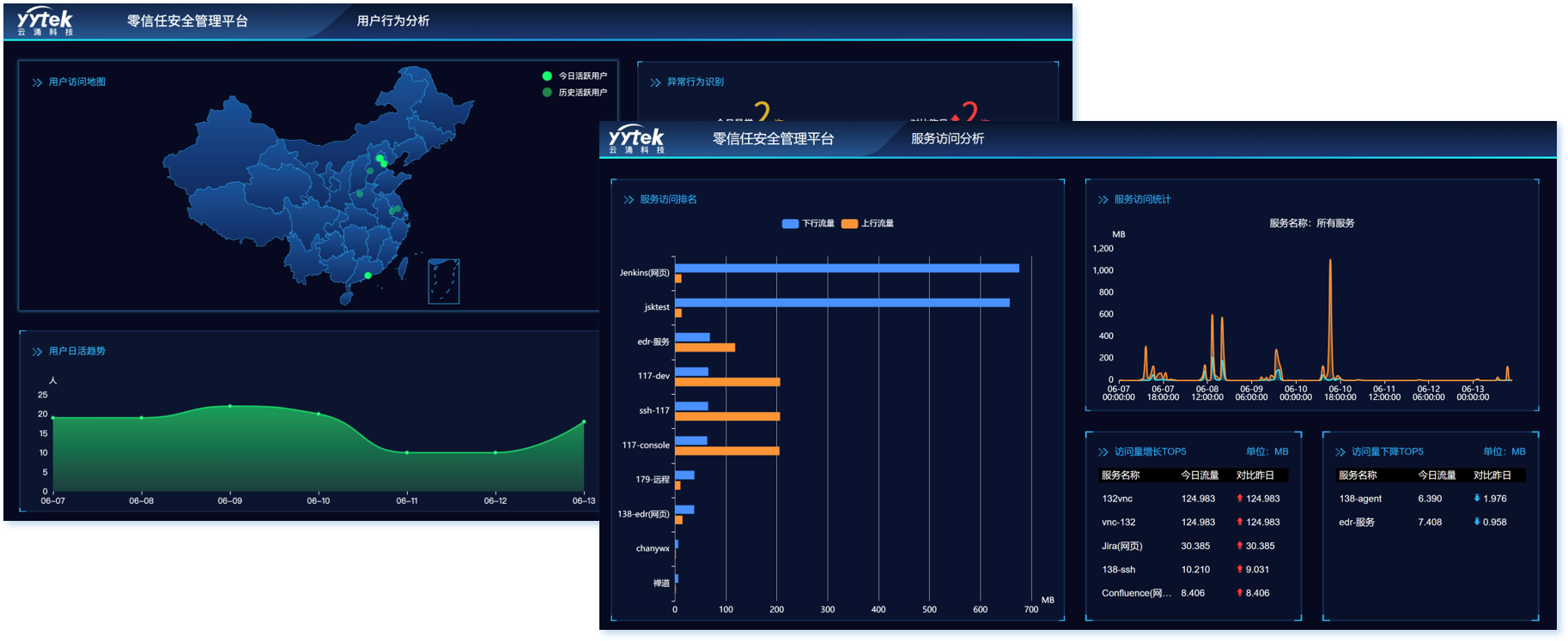 方案提供了用戶使用行為的態勢分析以及服務訪問態勢分析,通過態勢大屏展示方便日常管理及領導審閱。