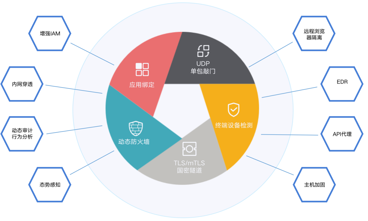 ? ? ? 零信任網絡訪問平臺融合了當前最新的安全技術,通過聯動的安全矩陣設計,形成一個整體的安全閉環。安全矩陣主要包括:SDP安全框架,遠程瀏覽器隔離,增強IAM, 內網穿透,動態審計與行為分析,態勢感知,端點檢測與響應EDR,主機加固,API代理等。