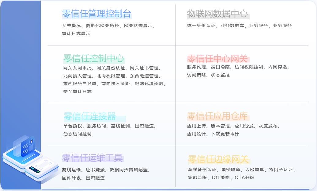 平臺由邊緣網(wǎng)關(guān)代理程序、網(wǎng)關(guān)離線運維工具、控制中心、接入網(wǎng)關(guān)、應(yīng)用倉庫等模塊組合而成。產(chǎn)品核心功能包括邊緣網(wǎng)關(guān)身份認(rèn)證、網(wǎng)關(guān)出入站訪問控制、網(wǎng)關(guān)間微隔離控制、邊緣應(yīng)用管理、網(wǎng)關(guān)安全運維、網(wǎng)關(guān)數(shù)據(jù)存儲透明加解密等。同時平臺保護(hù)網(wǎng)關(guān)與北向數(shù)據(jù)中心的訪問安全,包括端口隱藏,通訊加密等。