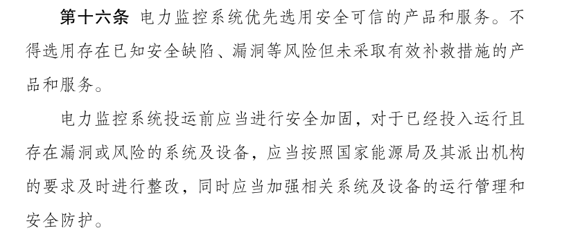 ? ? ? 第十六條明確提到:電力監(jiān)控系統(tǒng)優(yōu)先選用安全可信的產(chǎn)品和服務(wù)。