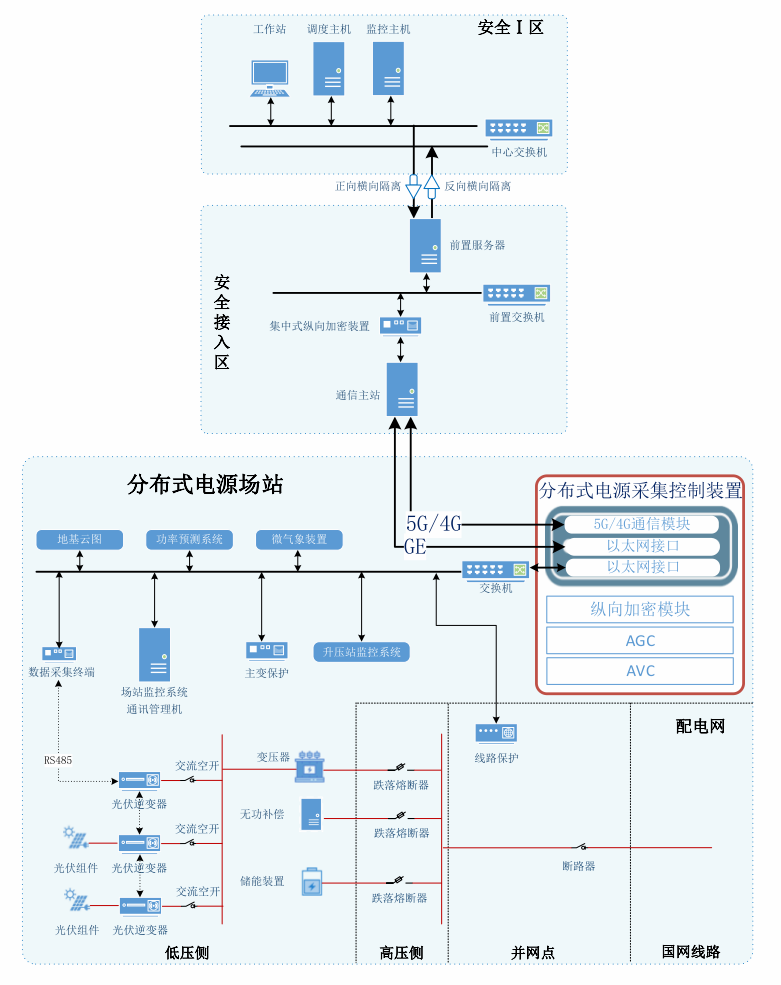 ???該裝置部署于分布式電源場(chǎng)站側(cè),基于無(wú)線專用通信網(wǎng)絡(luò)架構(gòu),集成縱向加密單元、無(wú)線通信模塊及 AGC/AVC 控制功能,通過(guò)電力專用通信通道接入生產(chǎn)控制大區(qū)安全接入?yún)^(qū),與調(diào)度主站建立安全通信鏈路,實(shí)現(xiàn)數(shù)據(jù)傳輸?shù)目煽啃耘c安全性。