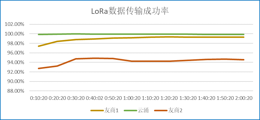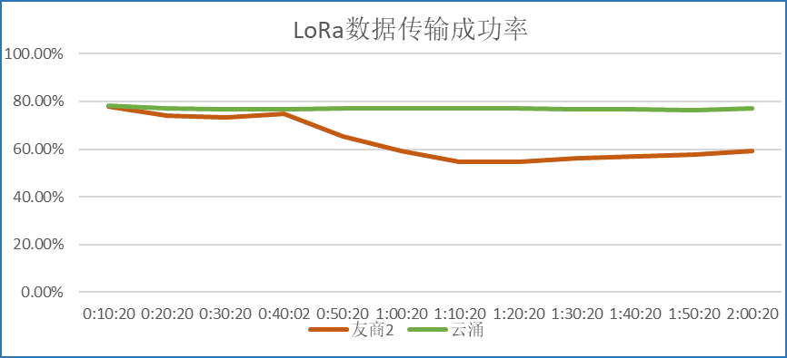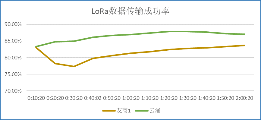 ? ? ? 在測試環境穩定且一致的條件下,通過同樣的連接方式,對比云涌LORA數傳電臺和另外兩家友商設備的測試結果,可以得出:云涌科技的LoRa DTU擁有更好的抗干擾能力,而且在同頻干擾的情況下,傳輸的成功率更高,傳輸的穩定性更好。