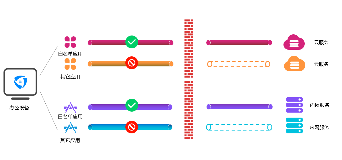 云涌零信任系統始終保證僅“合法”的本地應用才能訪問業務服務。只有經過管理員授權的應用進程才可以通過TLS隧道傳輸數據。系統將應用與服務綁定,提高服務訪問的安全性。