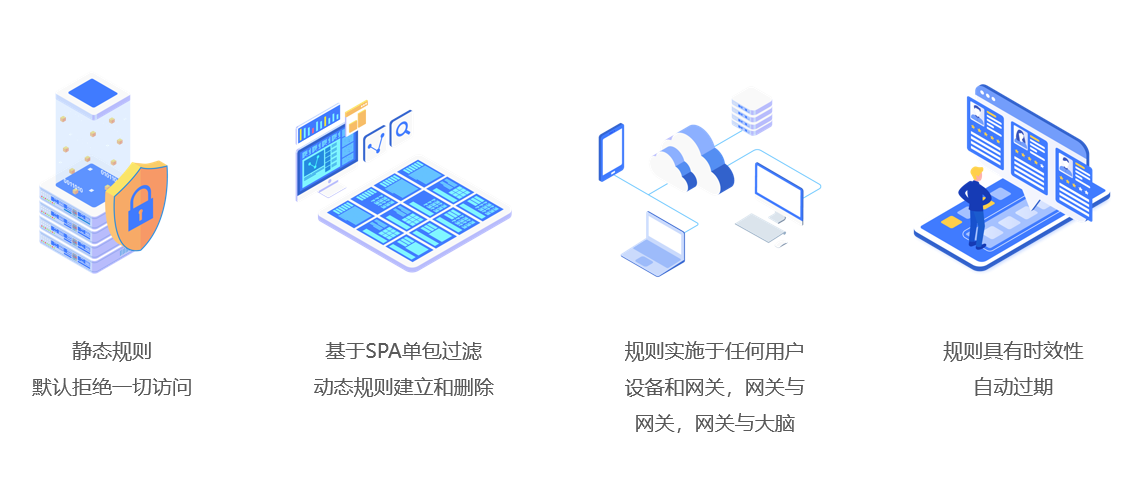 ? ? ? 產品基于先進的零信任理念即永不信任、始終驗證原則,采用SDP軟件定義邊界網絡安全架構,通過服務隱藏及單包敲門技術、細顆粒度最小授權管理及風險動態識別能力,通過微隔離、防數據泄漏等手段,提供安全可靠的網絡接入與訪問控制,打造平臺級的身份與數據安全管控系統,重點解決企業遠程網絡接入安全,以及企業工業設備的南北向數據接入安全以及東西向數據訪問安全。
