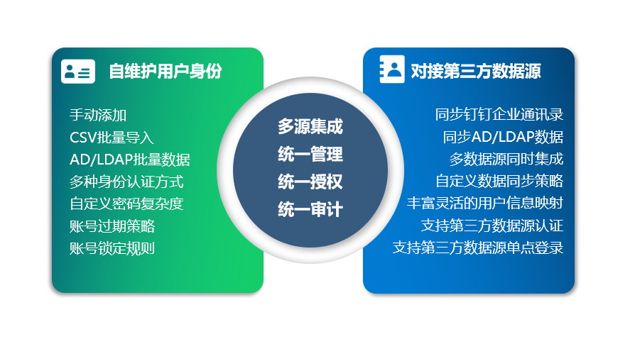 云涌零信任安全管理平臺既支持主流企業通訊錄系統的數據導入與同步,也支持自建用戶體系。實現了在一個平臺對企業人員、部門以及角色組的統一高效管理。同時系統提供多種用戶認證方式,全方位滿足各種需求場景。