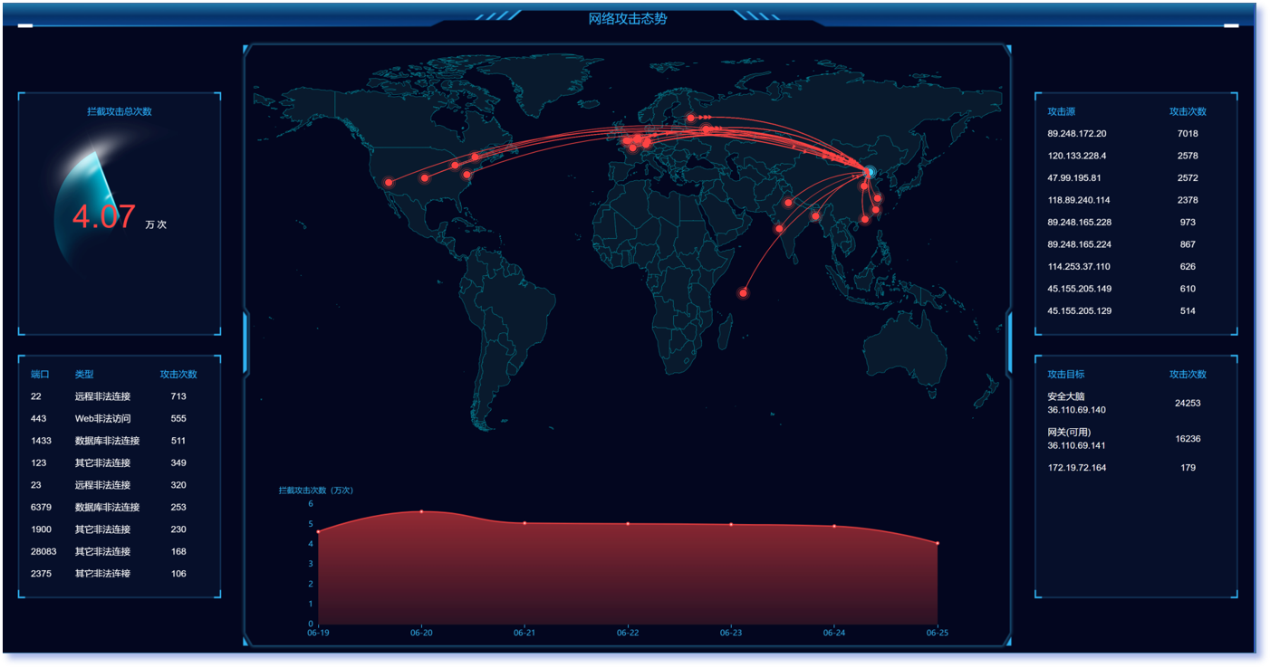 ?云涌提供了基于零信任系統的網絡攻擊態勢感知,管理端大屏展示從攻擊源到攻擊目標的實時態勢;